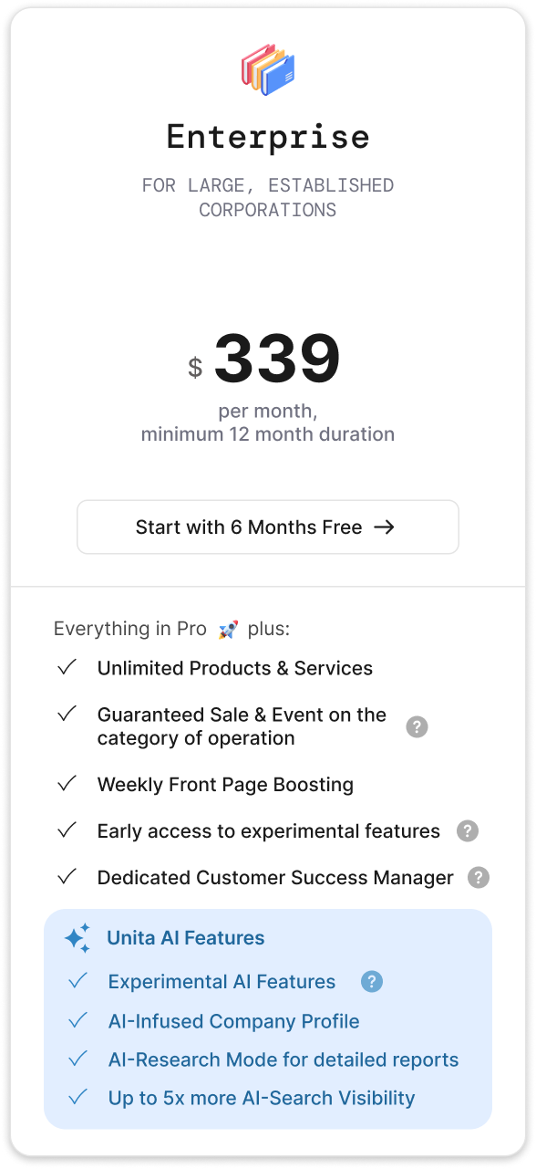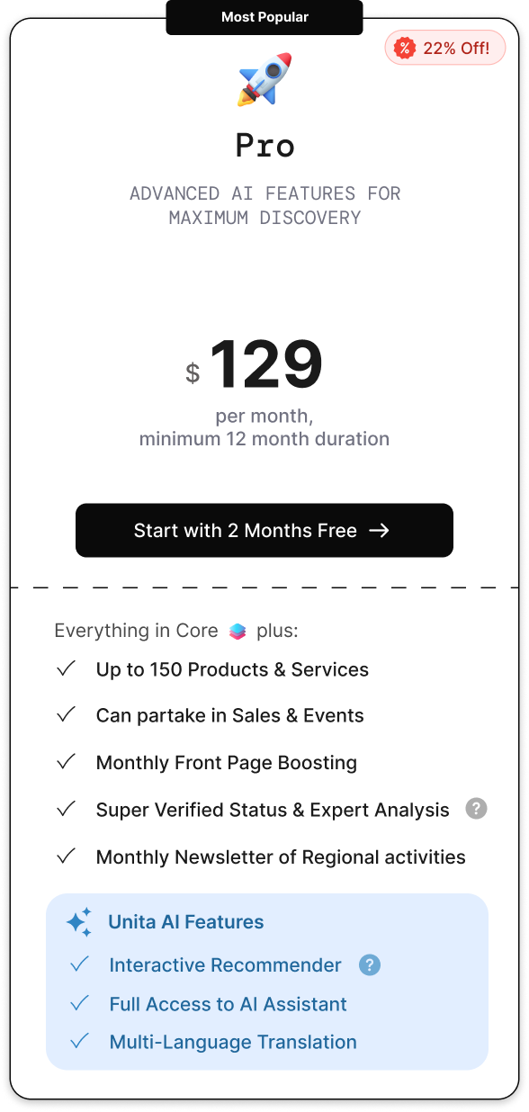 Unita enables an AI-Enhanced Platform where businesses can better showcase their offerings, find partners, enter new markets and simplify communications.